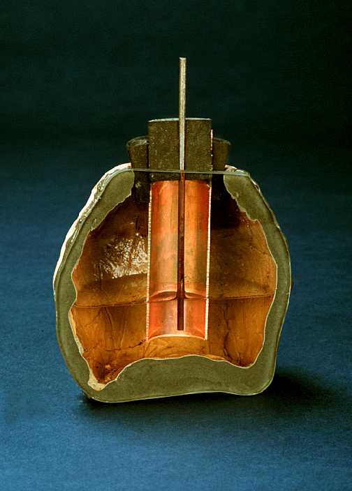 Tratava-se de um pequeno vaso de argila dentro do qual havia um tubo feito de chapa de cobre, com um diâmetro de aproximadamente 2,5 cm. por uns 10 cm. de comprido. A base do tubo estava selada por um disco, também de cobre. Uma barra de ferro, aparentemente corroída por ácido, se projetava através de uma tampa de asfalto na parte superior.